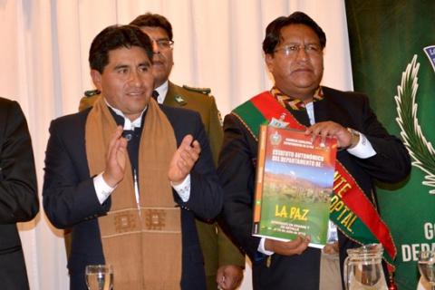 El presidente del Tribunal Constitucional Plurinacional, Efren Choque, entregó el Estatuto Autonómico al presidente de la Asamblea Departamental de La Paz, Nelson Huarachi, en presencia del Gobernador César Cocarico, el Presidente del Senado, Eugenio Rojas, el alto mando militar, autoridades sindicales y organizaciones sociales.