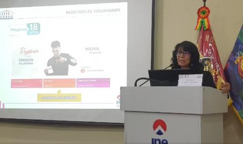 La coordinadora general del Programa del Censo de Población y Vivienda, Martha Oviedo, explicó que el registro de censistas voluntarios se podrá efectuar a través de las plataformas digitales del Censo de Población y Vivienda, cuyo enlace ‘yocenso.ine.gob.bo’ estará disponible el 9 de octubre para estudiantes, docentes y público en general.