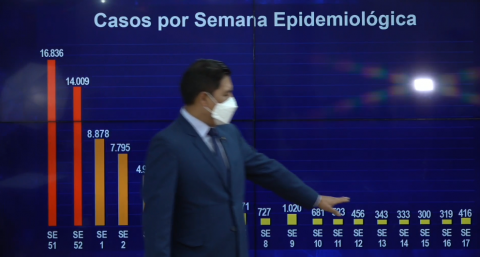 “En la semana epidemiológica 17 se presentaron 416 casos (Covid -19), esto representa 97 casos más que la semana anterior, un incremento del 30%, son dos semanas consecutivas en las que se registra un leve incremento de la Covid-19, pero, a pesar de estos incrementos, estamos en los niveles más bajos de la pandemia”, dijo el ministro de Salud, Jeyson Auza.