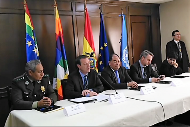 Esta mañana el ministro Carlos Romero y el representante de la Oficina de Naciones Unidas para la Droga y el Delito en Bolivia (UNODC), Thierry Rosten firmaron un Memorandum de Entendimiento para el Proyecto de Comunicación Aeroportuaria AIRCOP, que es financiado por la Unión Europea (UE).