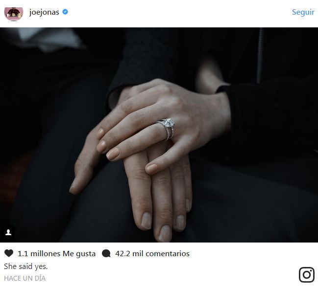 Joe Jonas, líder de la banda DNCE, publicó en su cuenta de Instagram una foto muy romántica de sus manos junto a las de su novia, SophieTurner, con la sorpresiva declaración: "ella dijo que sí". En la imagen se puede ver el anillo de compromiso en un primerísimo plano, prueba irrefutable de que la pareja ya está planeando su casamiento.