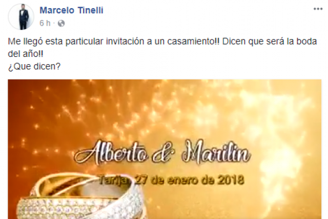 "Me llegó esta particular invitación a un casamiento. ¡Dicen que será la boda del año! ¿Qué dicen?", escribió Tinelli junto al video invitación, que en menos de cuatro horas ya fue compartido más de 300 veces.